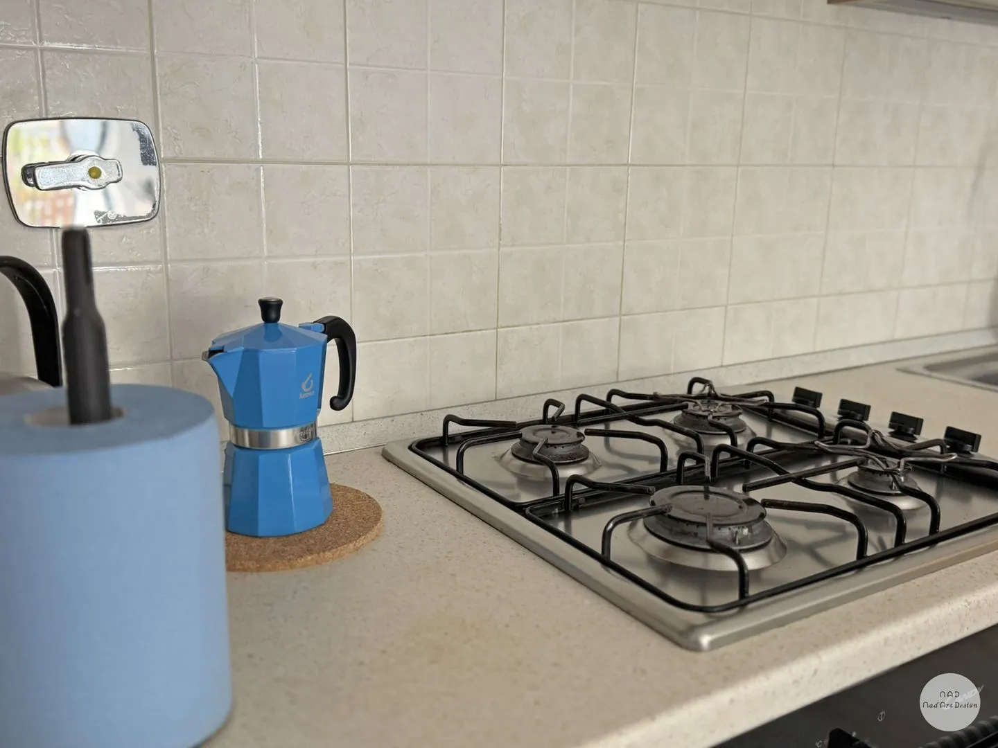 Die offene Küche ist voll ausgestattet und verfügt über einen Gasherd mit vier Kochplatten, einen Backofen, eine Spülmaschine, einen Kühlschrank mit Gefrierfach, Mikrowelle, Kaffeemaschine, Nespresso-Espressomaschine, Wasserkocher sowie sämtliche Küchenutensilien und Geschirr. Ein Esstisch und Geschirrhandtücher sind selbstverständlich vorhanden.